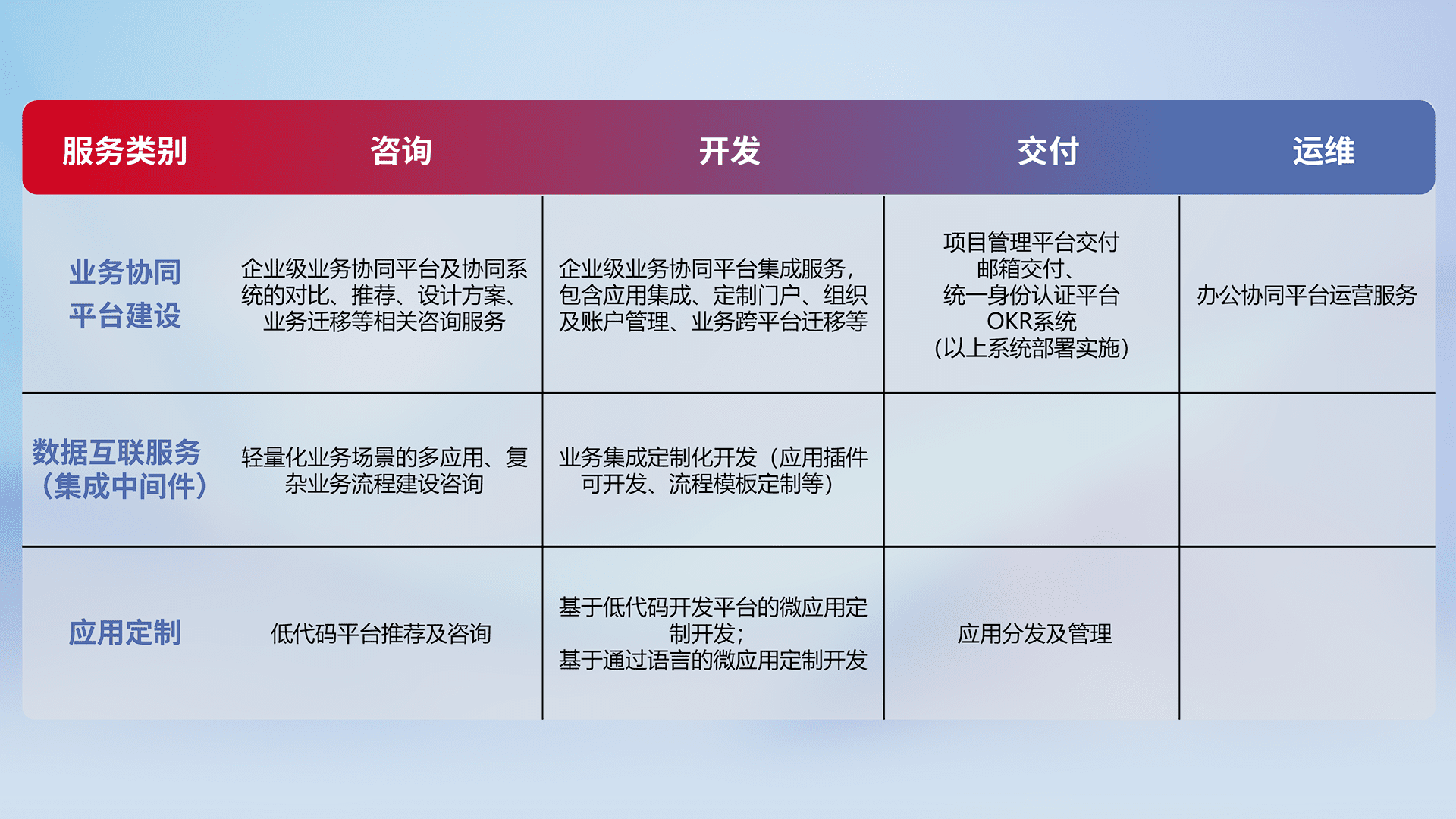 针对钉钉、、、、企微、、、IDaas等平台级产品提供产品的规划、、、、方案、、、交付、、定制化开发等服务,,,,实现如统一协同办公、、、、智能客户服务、、混合会议管理、、智能数据查询、、等业务场景,,,,实现数字化转型。。。